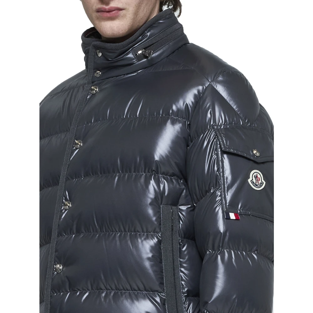Blijf warm en stijlvol met Moncler's Gourette grijze gewatteerde en gevoerde nylon donsjack voor heren. Deze jas heeft een hoge kraag, rits met verborgen capuchon, verborgen rits- en drukknoopsluiting, zijzakken met rits, klepzak met logopatch op de mouw, elastische manchetten en ton-sur-ton grosgrain piping