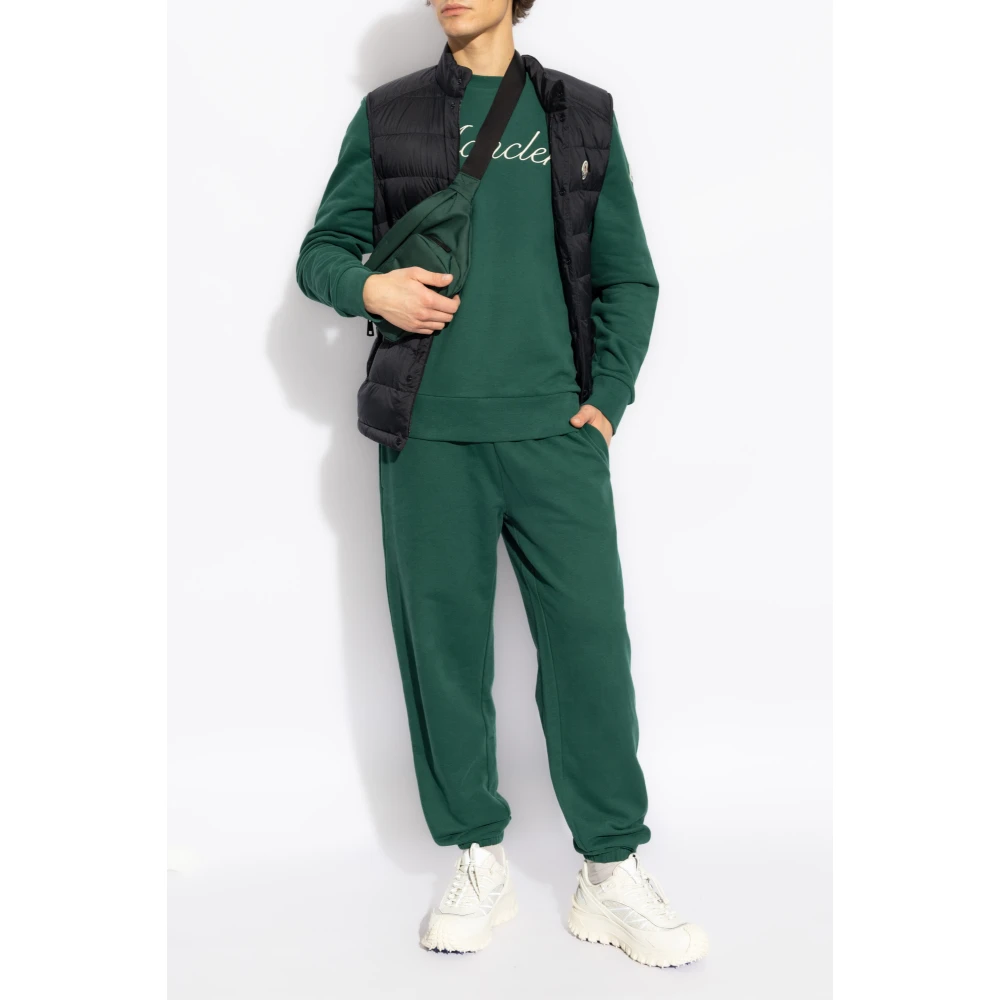 Wij presenteren een Sweatshirt MET Logo van het gerenommeerde merk Moncler, dat sportieve chic harmonieus combineert met elegantie. Deze klassieke sweatshirt met ronde hals, in een dominante groene kleur, valt op met een groot, wit