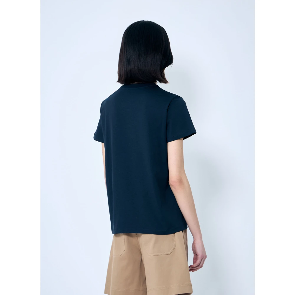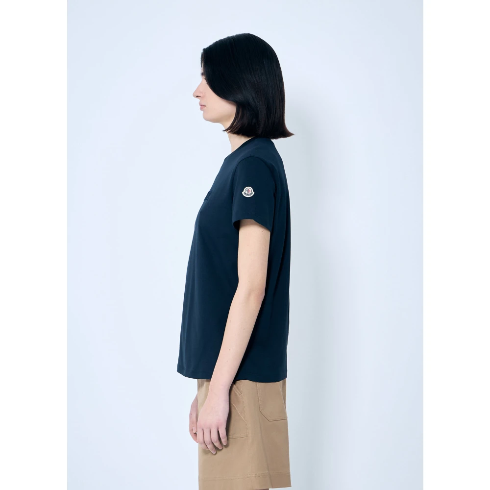 Moncler navy blauw t-shirt met ronde hals en logo patch op de mouw en korte mouwen, ideaal voor vrouwen