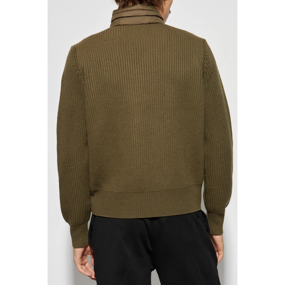 Wij presenteren een verfijnde Heren Vest met een gewatteerde voorkant, die de essentie van elegantie en functionaliteit belichaamt. Dit product combineert modern design met vakmanschap van de hoogste kwaliteit, waardoor het een uitstekende keuze is voor koelere dagen. De voorkant van het vest, in een dominante groene kleur, is gemaakt van een materiaal dat lijkt op nylon of polyester, wat zowel lichtheid als bescherming tegen de kou biedt. Een tweewegrits over de hele lengte van de voorkant voegt praktisch nut toe. De achterkant en mouwen van het vest zijn gemaakt van een dikker, gebreid materiaal met een kabelstructuur, ook in het groen. Dit zorgt ervoor dat het vest er niet alleen stijlvol uitziet, maar ook warmte en comfort biedt. Een hoge kraag, die een verborgen capuchon verbergt, biedt extra bescherming tegen de kou. Op de linkerschouder bevindt zich het kenmerkende Moncler-logo - een witte cirkel met een rood en blauw motief en de inscriptie