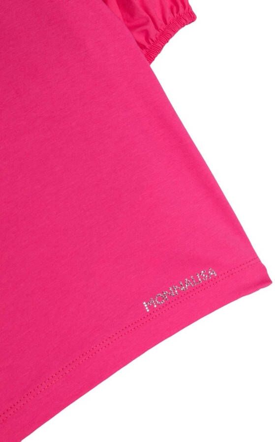 Felroze, logo met steentjes, ronde hals, korte pofmouwen en rechte zoom.