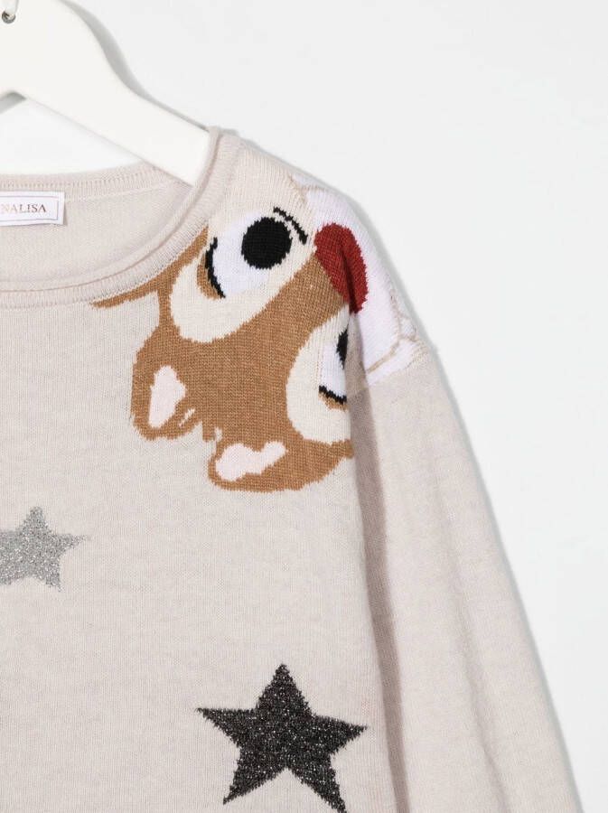 Beige, veelkleurig, fijngebreid, geborduurd design, geborduurde ster, ronde hals, lange mouwen en geribbelde zoom.