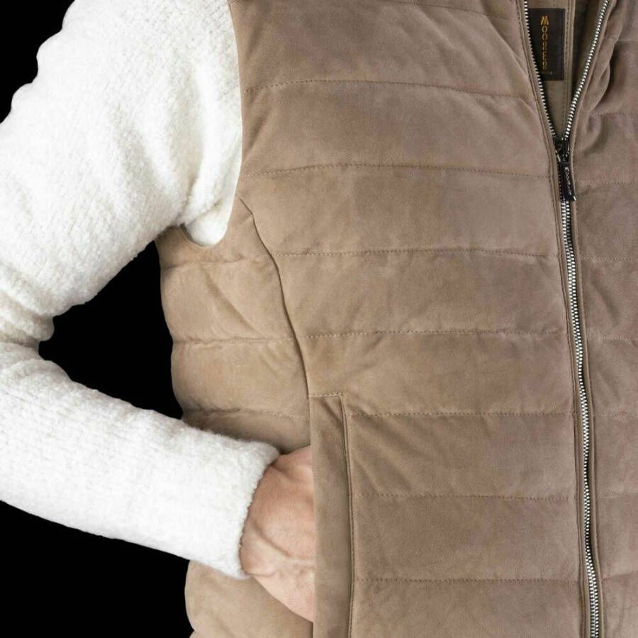 Suede schapenvacht Gilet met directe injectie Goose Down Boudin quilten. Gesipte verticale zijkantzakken in de taille. Interne drawstring bij hem, dubbele binnenzak voor waardevolle spullen en logo -lintdetails. Deze beschrijving is automatisch vertaald