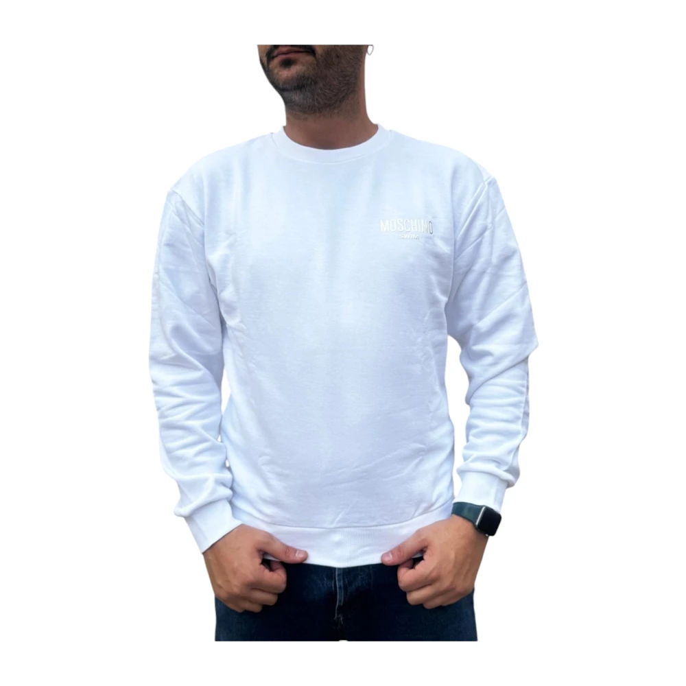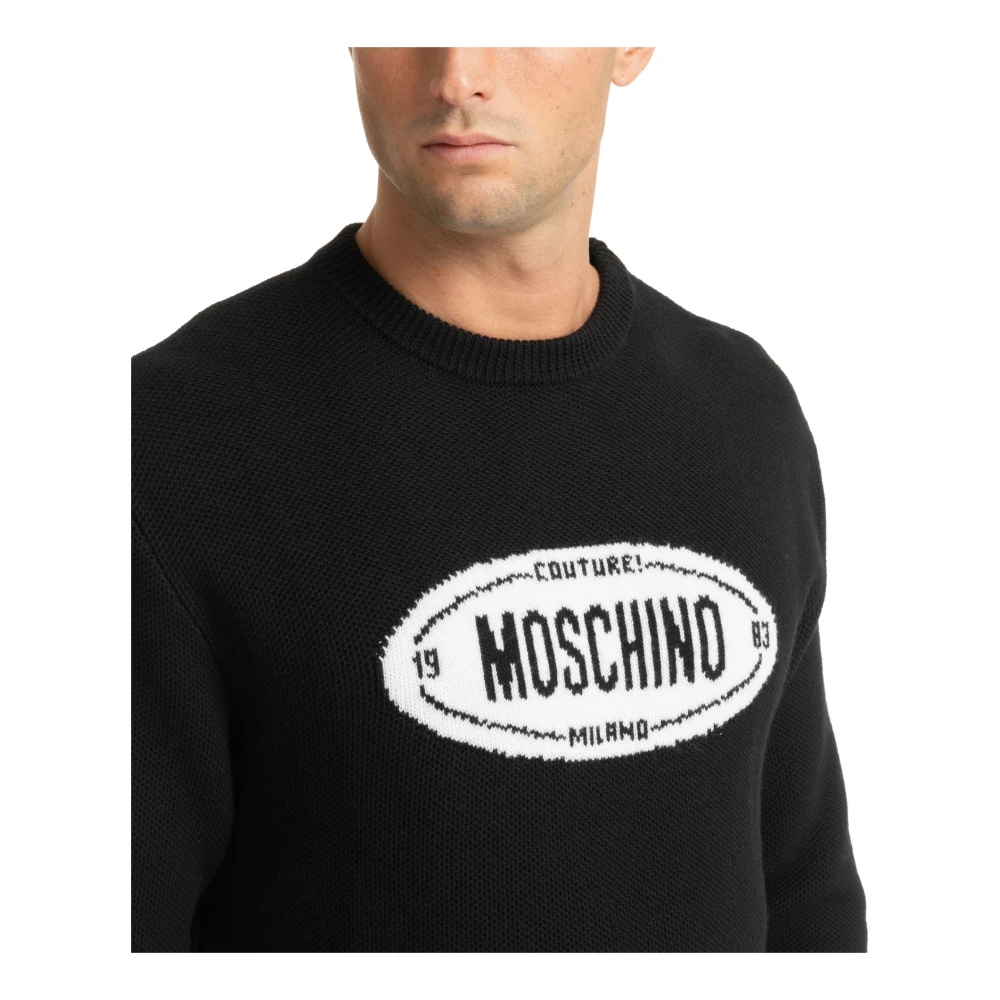 Blijf stijlvol en warm met deze Moschino ronde-hals gebreide trui voor mannen. Voorzien van een abstract patroon met logo details en borduursels, gemaakt van 100% zuivere wol.