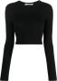 Zwart, fijne ribbels, uitgesneden detail , logo-relif aan de achterkant, ronde hals, lange mouwen, rechte zoom en cropped.