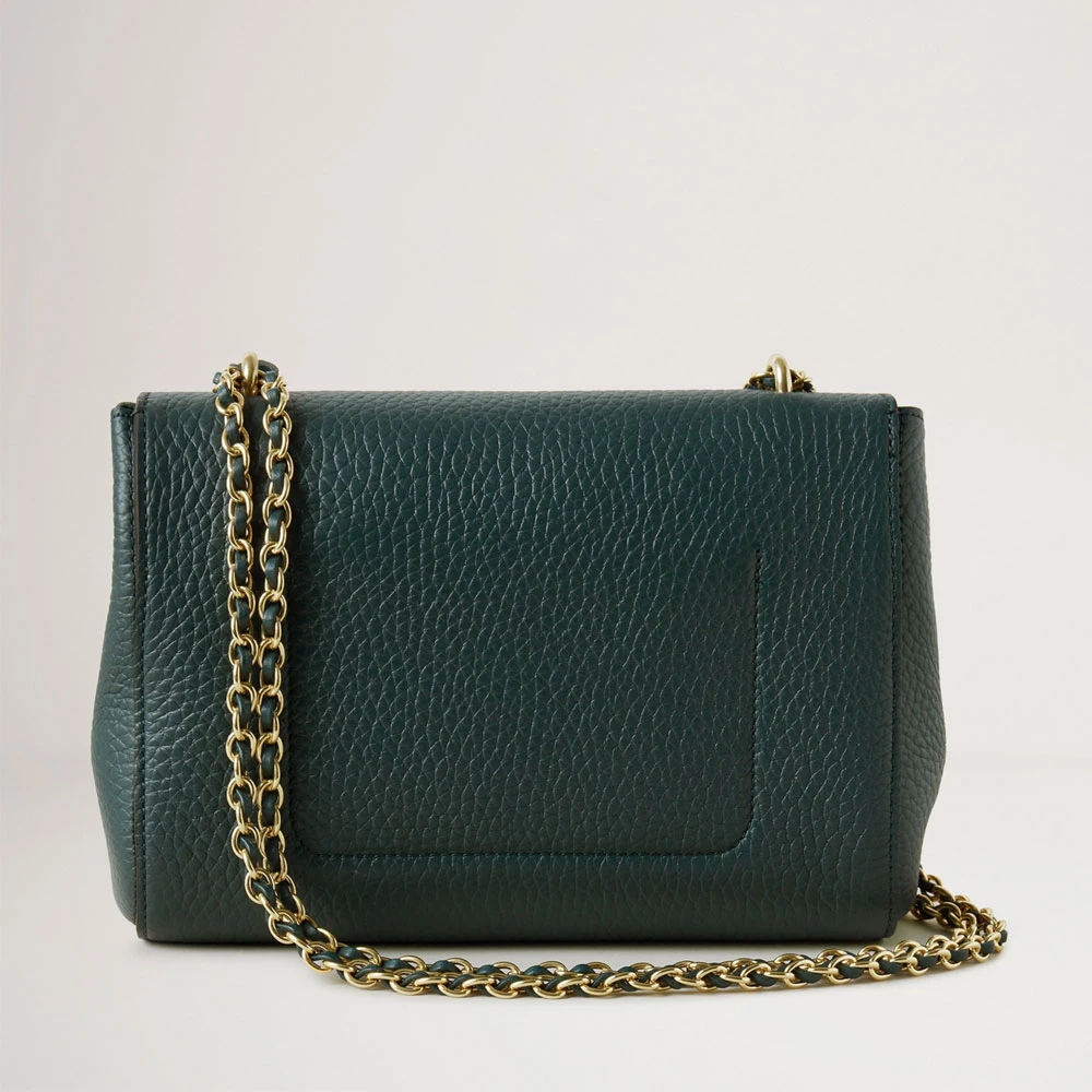Mulberry Lily Schoudertas in Mulberry Green Heavy Grain leer. Elegant en veelzijdig, perfect als avondtas. Voorzien van een gevlochten leren en kettingriem, messing hardware afwerking, postsluiting en een binnenzak. Afmetingen: H17 x L21 x D9 cm. Handvat drop: 29 cm. Ketting Schouderriem lengte: 119 cm.