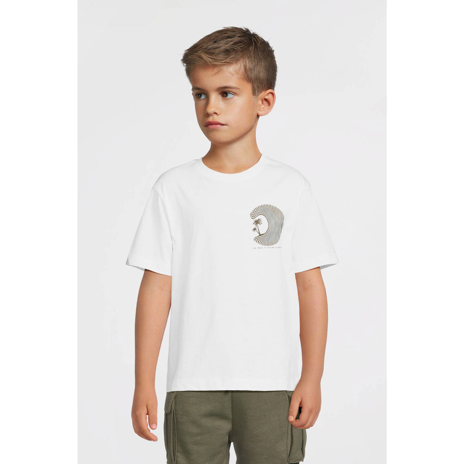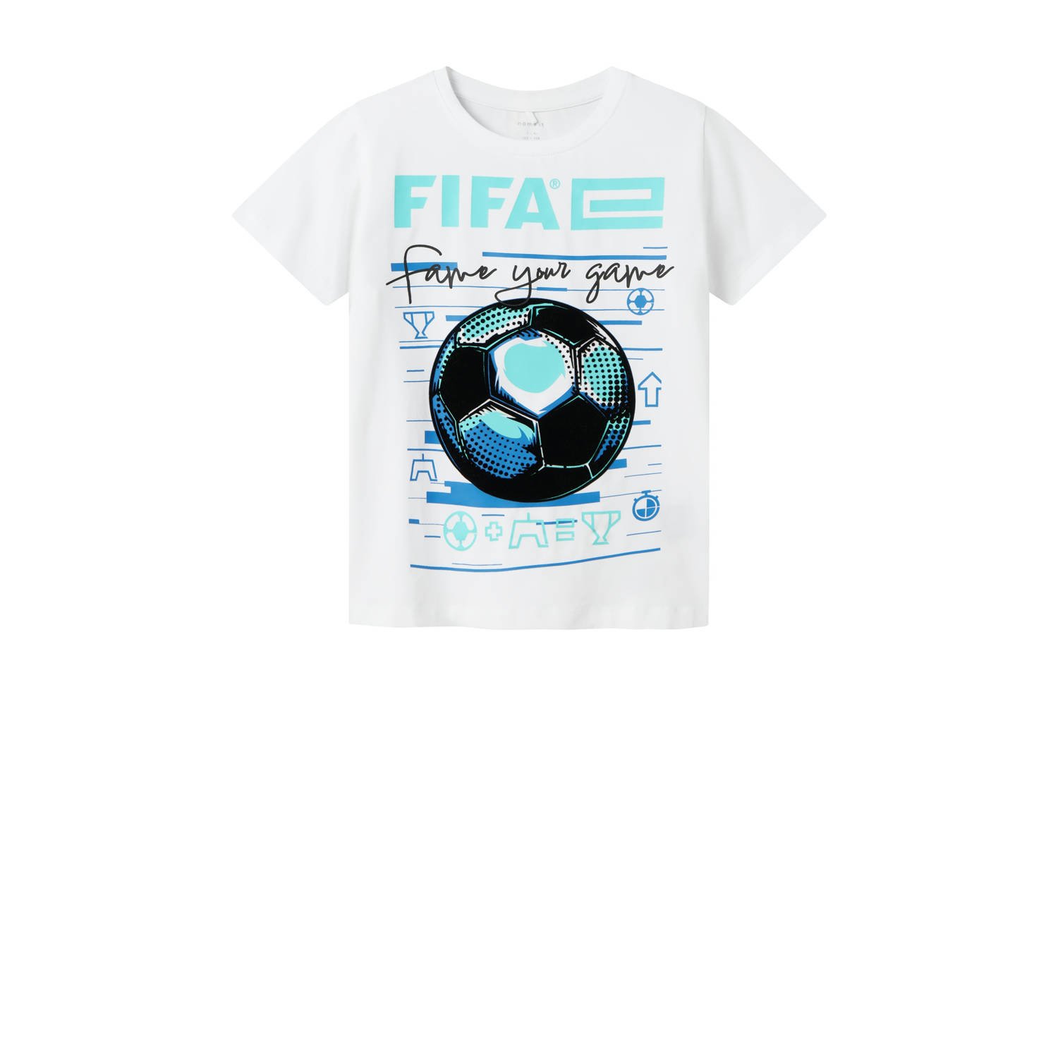 dit NAME IT KIDS T-shirt voor jongens heeft een ronde hals en korte mouwen naam NAME IT KIDS staat op het label het shirt is gemaakt van 100% katoen de kleuren zijn wit, beige en blauw