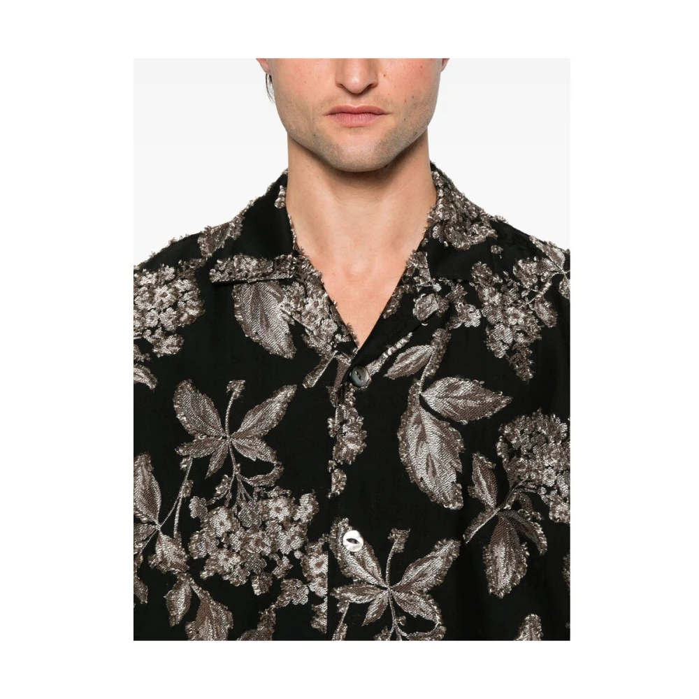 Upgrade je stijl met dit Needles zwart/lichtbruin bloemen jacquard overhemd met korte mouwen, voorzien van een Cubaanse kraag, drop shoulder, knoopsluiting aan de voorkant, twee voorzakken en een rechte zoom.