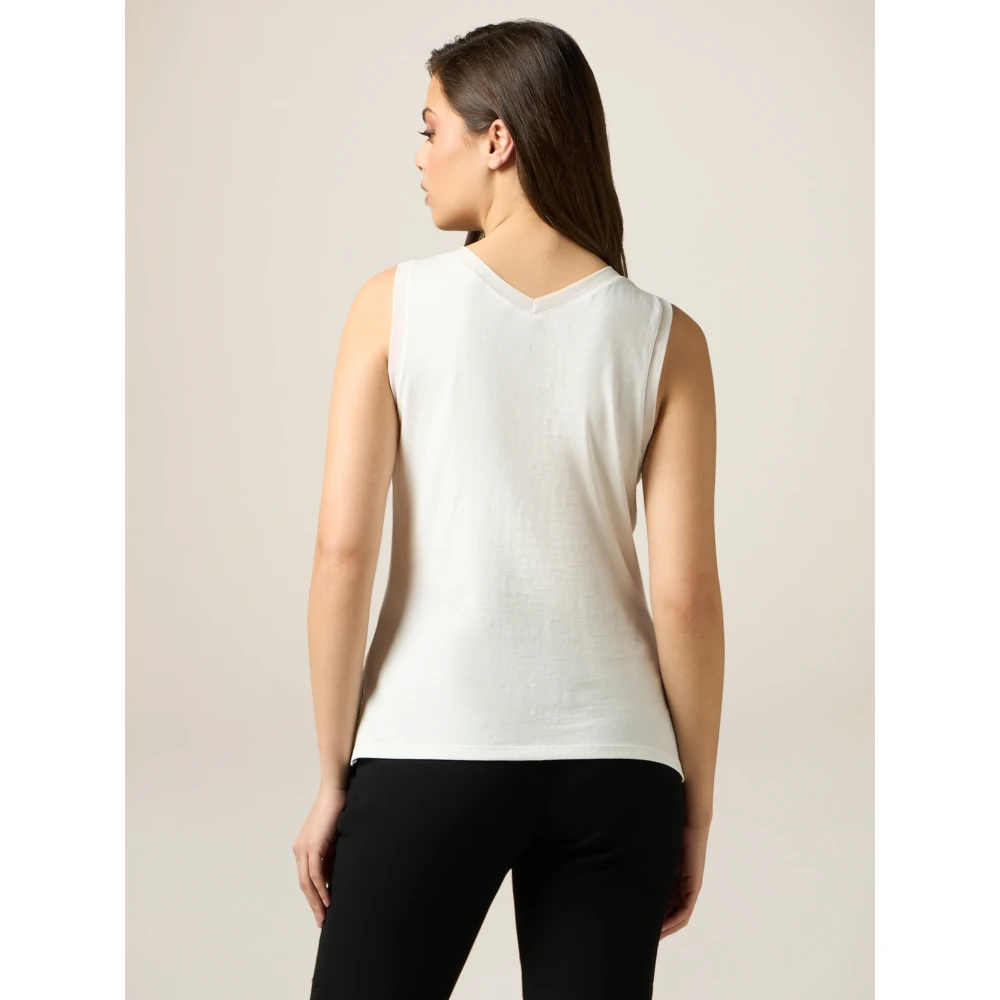 Upgrade je garderobe met deze mouwloze top van Oltre voor vrouwen. Gemaakt van 100% katoenen jersey, heeft deze top een V-hals en is versierd met kristallen details aan de voorkant. De zijsplitten in de zoom en kleurgecordineerde tule afwerking voegen een vleugje elegantie toe. Samenstelling: hoofdstof - 100% katoen; secundaire stof - 95% polyester, 5% elastaan. Wasvoorschriften: machinewas op 30 graden, niet in de droger, niet bleken, plat drogen, niet chemisch reinigen, strijken op maximaal 110C.
