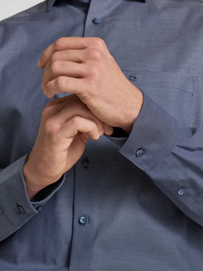 Zakelijk overhemd van OLYMP. Look: All-over motief. Pasvorm: Regular fit. Overhemdkraag: Kentkraag. Knoopsluiting: doorknoopsluiting. Motief: Stippenmotief. Applicatie: Labelstitching. Mouwvorm: lange mouwen. Type manchet: Sportmanchetten. Bijzondere kenmerken: strijkvrij. Zakken: opgestikte borstzak. Materiaalverwerking: Geweven stippen. Materiaal: puur katoen. Ruglengte bij maat 40: 79 cm. Schouderbreedte bij maat 40: 46 cm. Mouwlengte bij maat 40: 65 cm