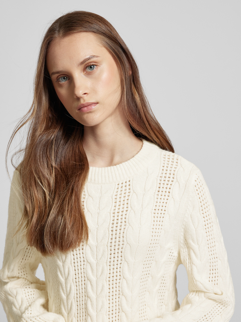 Gebreide damespullover van Only. Model 'Rubina'. Look: effen. Pasvorm: Regular fit . Motief: Kabelpatroon, ajourpatroon. Kraagmodel: Hoge ronde hals. Mouwvorm: Ballonmouwen, lange mouwen. Mouwboord: geribd. Rompzoom: geribd. Materiaalverwerking: Knitwear. Materiaal: Viscosemix. Ruglengte bij maat S: 53 cm. Borstomvang bij maat S: 52 cm. Mouwlengte bij maat S: 60 cm