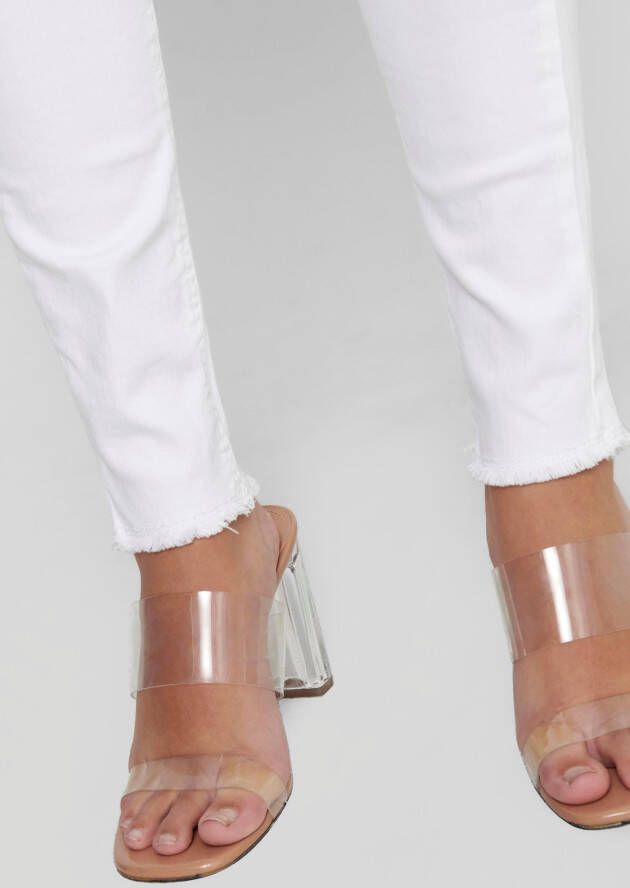 Skinny fit damesjeans van Only. Model 'Blush'. Look: effen. Pasvorm: Skinny fit. Bandhoogte: Mid rise. Lengte: Enkel. Applicatie: platte studs. Details: Riemlussen. Sluiting: Knoop en blinde ritssluiting. Pijpboorden: korte franjes. Zakken: 5-pocketdesign. Materiaalverwerking: Denim. Materiaal: Katoenmix. Bandwijdte bij maat S/32: 34 cm. Binnenbeenlengte bij maat S/32: 69 cm