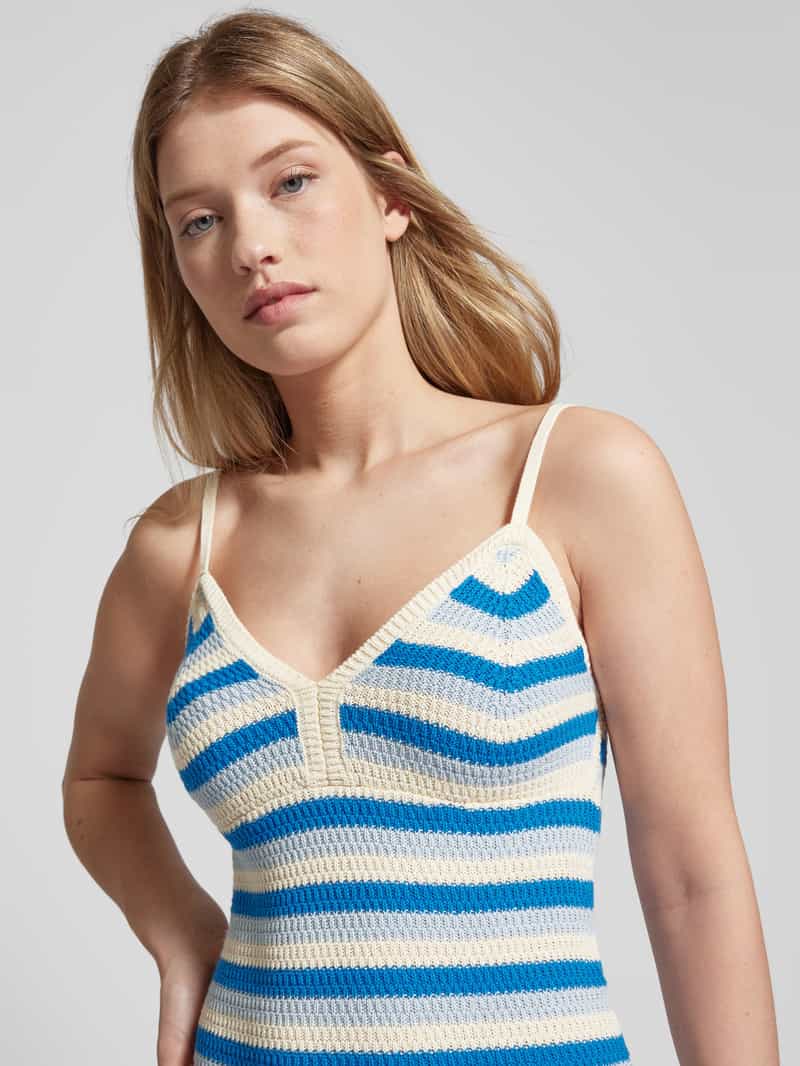 Gebreide jurk van Only. Model 'Shanni'. Look: All-over motief. Pasvorm: aansluitend. Lengte: Mini . Hals: V-hals. Motief: gestreept. Model bandjes: verstelbare spaghettibandjes. Gelegenheid: Vrije tijd. Materiaalverwerking: Knitwear. Materiaal: puur katoen. Totale lengte bij maat S: 89 cm. Borstomvang bij maat S: 33 cm
