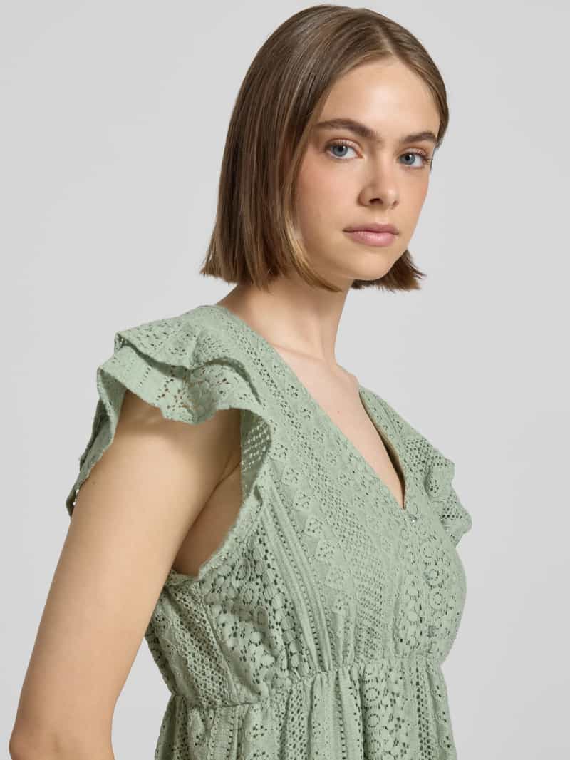 Kanten jurk van Only. Model 'Helena'. Look: effen. Pasvorm: licht uitlopend. Lengte: Mini . Hals: V-hals. Details: elastische tailleband. Sluiting: korte knoopsluiting. Mouwvorm: korte mouwen, volant. Gelegenheid: Vrije tijd. Materiaalverwerking: Kant. Materiaal: puur katoen. Totale lengte bij maat S: 83 cm. Borstomvang bij maat S: 40 cm. Schouderbreedte bij maat S: 32 cm