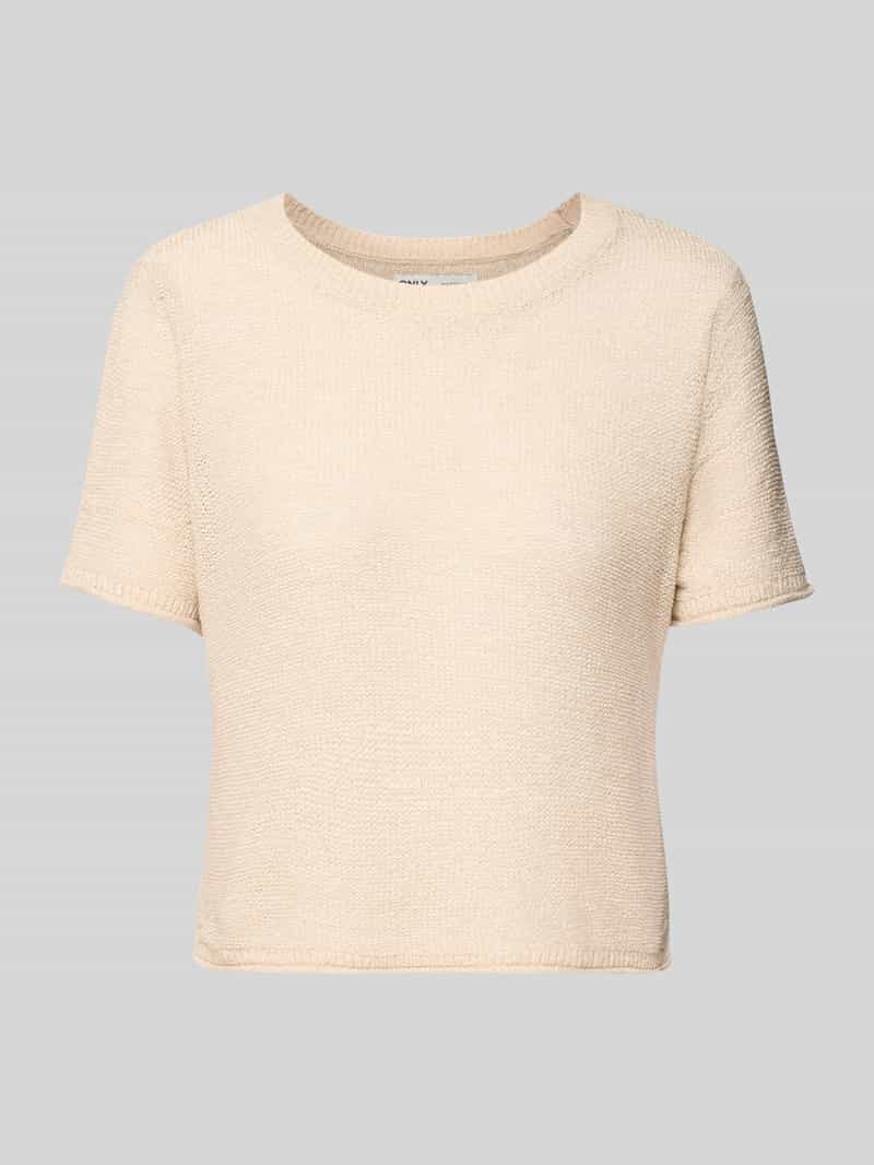 Damespullover van Only. Model 'Sunny'. Look: effen. Pasvorm: Regular fit. Lengte: Kort. Details: Rolzoom. Hals: ronde hals. Mouwvorm: korte mouwen. Materiaalverwerking: Knitwear. Ruglengte bij maat S: 49 cm. Borstomvang bij maat S: 46 cm. Mouwlengte bij maat S: 19 cm