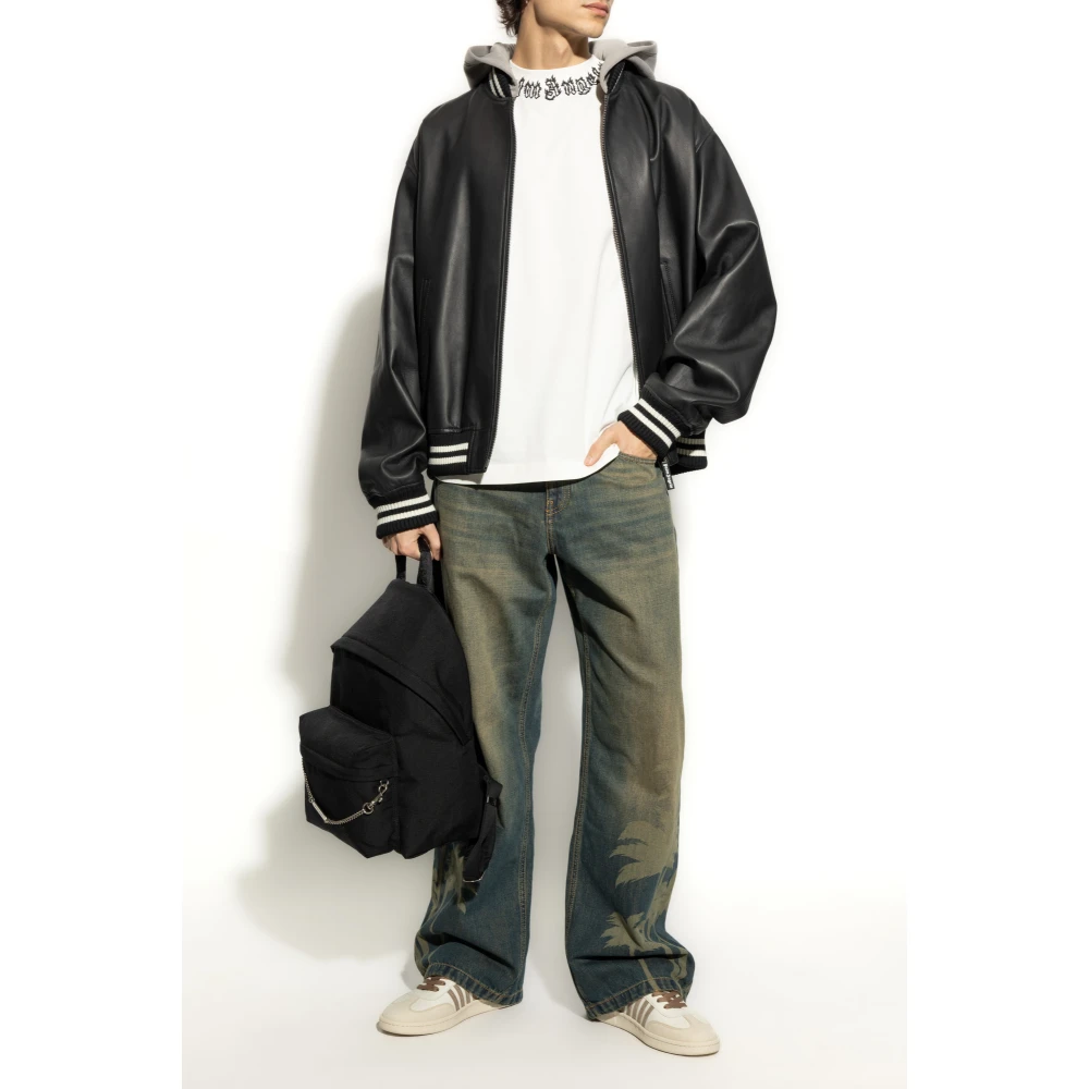 Maak kennis met het Lederen Jack uit de exclusieve modieuze collectie van Palm Angels. Deze zwarte jas, volledig gemaakt van de hoogste kwaliteit leer, combineert een sportieve bomberstijl met elegante details. De kenmerkende gestreepte ribboord aan de onderkant en manchetten voegt een dynamische touch toe. Aan de achterkant is er een gedurfd wit