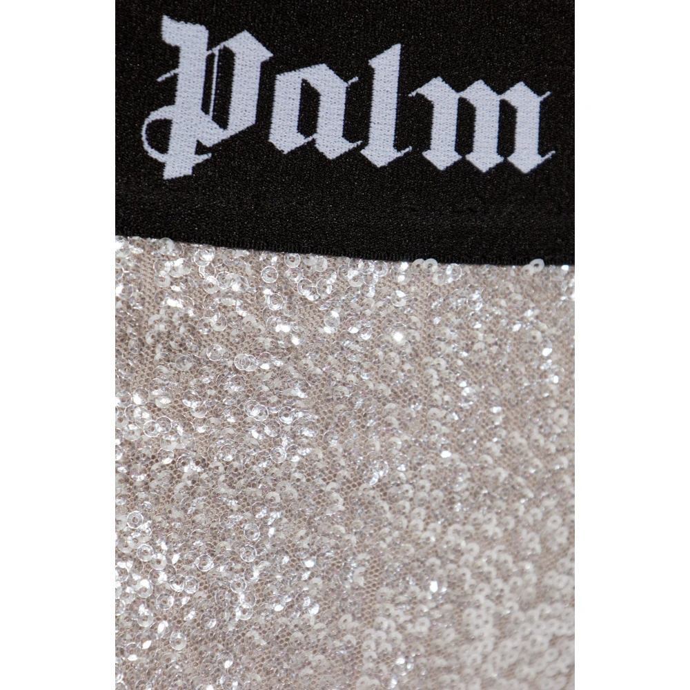 Ontdek ongevenaarde chic met Sequin Trousers uit de exclusieve Palm Angels-collectie. Deze uitzonderlijke broek heeft een Rechte Maar Lichtelijk Uitlopende Snijt die de silhouet accentueert en elegantie toevoegt aan elke outfit. Gemaakt van stof bedekt met zilveren pailletten, trekken ze de aandacht met hun opvallende, glanzende uitstraling. De tailleband heeft een zwart elastisch band met een wit