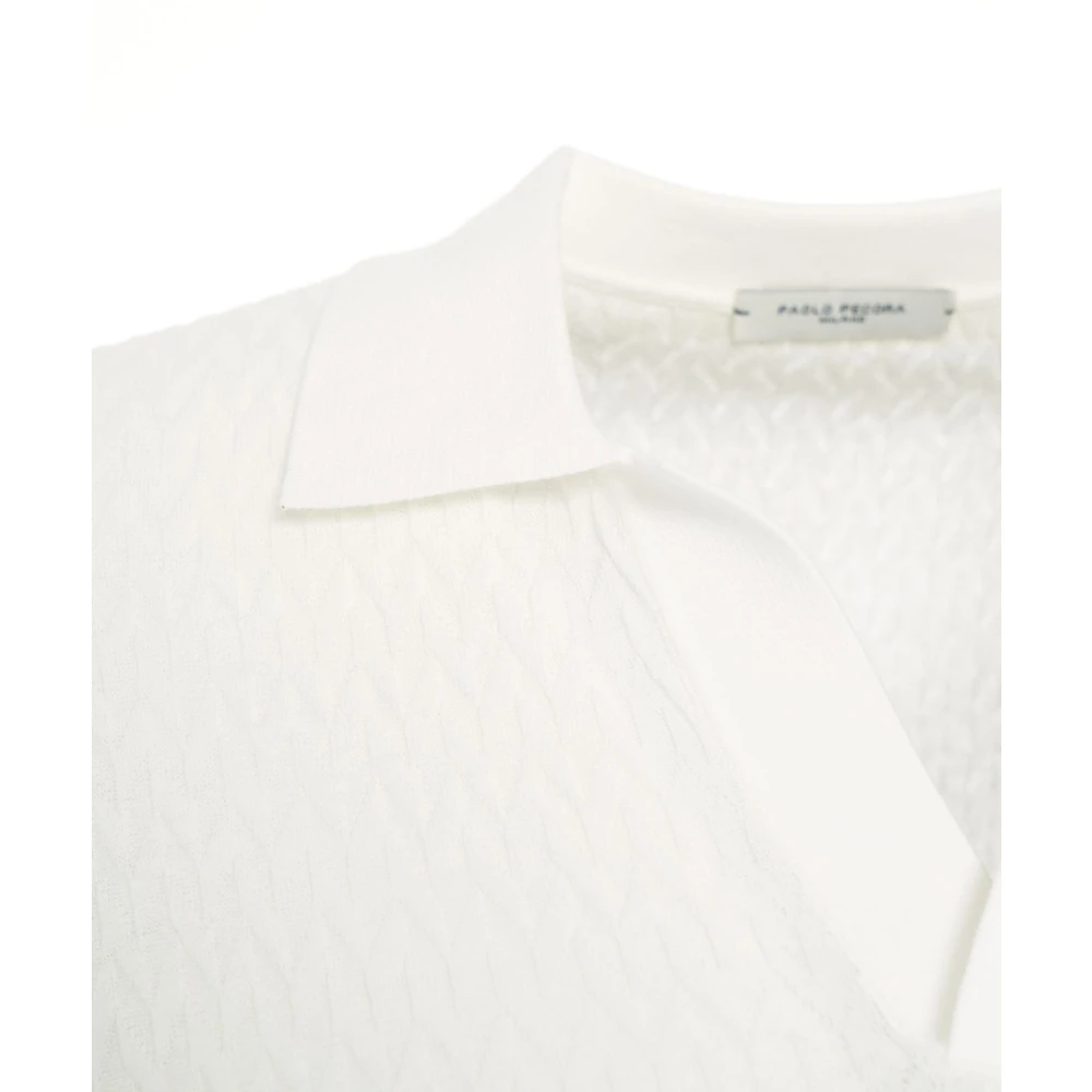 Upgrade je garderobe met deze stijlvolle witte gebreide poloshirt van Paolo Pecora. Gemaakt van 100% katoen, heeft het een geribbelde kraag en manchetten, een flatterende v-hals en is perfect voor informele uitstapjes of smart-casual evenementen. Modelhoogte: 190 cm; Maat: L, Handwas.