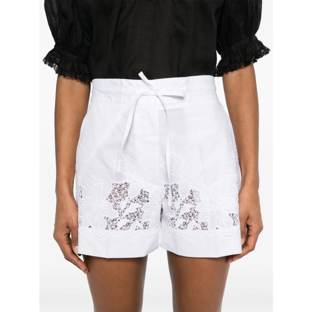 Upgrade je zomerse stijl met deze P.a.r.o.s.h. White Chocolate Shorts. Gemaakt van hoog getailleerd katoen met een trekkoord, schuine zijzakken, bloemenkant details en verborgen sluiting aan de voorkant. Perfect voor de modebewuste vrouw.