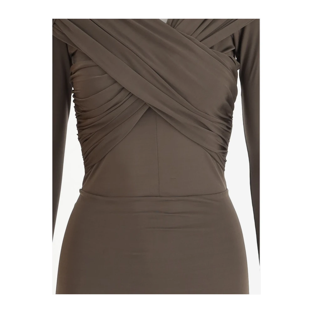 Upgrade je garderobe met deze Patou midi-jurk gemaakt van een luxueuze rayon mix. Met lange mouwen, gekruiste voorbanden, een flatterende V-halslijn en een rechte zoom straalt deze bruine jurk elegantie uit. Gemaakt in Portugal met een samenstelling van 94% rayon en 6% elastaan. Verkrijgbaar in maat S. Modelhoogte: 175 cm, borst: 86, 5 cm, taille: 65 cm, heupen: 92 cm, schouder: 40 cm.