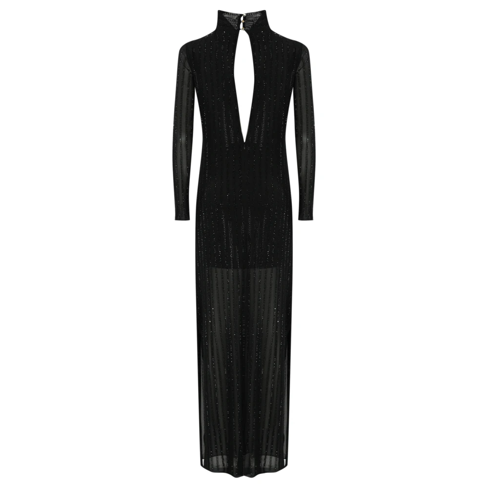 Verrijk je stijl met deze prachtige Patrizia Pepe maxi jurk. Gemaakt van stretchstof, deze lange jurk voor vrouwen heeft lange mouwen, een hoge kraag en all-over strass banden voor een vleugje glamour. Perfect voor speciale gelegenheden of avondevenementen. Samenstelling: 95% Polyamide, 5% Elastaan. Voering: 95% Polyester, 5% Elastaan.