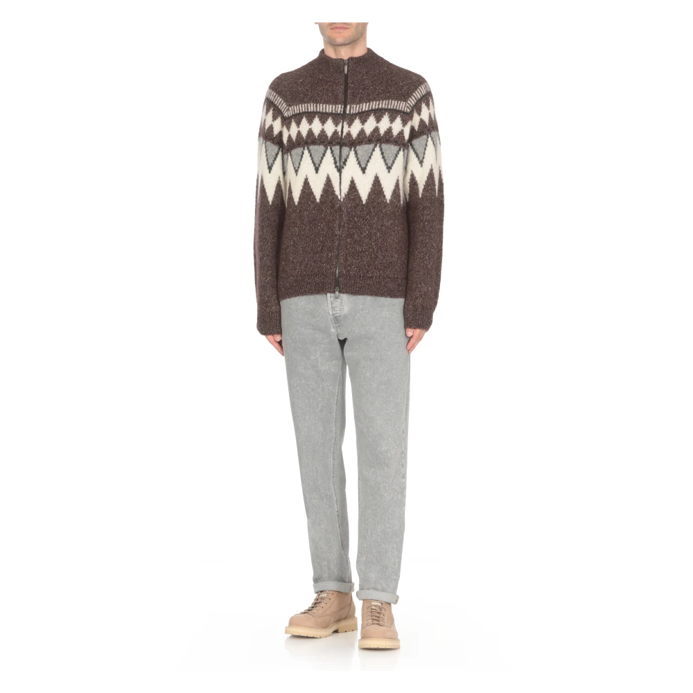 Blijf stijlvol en warm met deze bruine Peserico cardigan voor mannen. Voorzien van een ronde hals, lange mouwen, ritssluiting aan de voorkant en een contrasterend geometrisch patroon in kleur. Compleet met elastische geribbelde afwerkingen. Model is 190 cm lang en draagt maat 50.