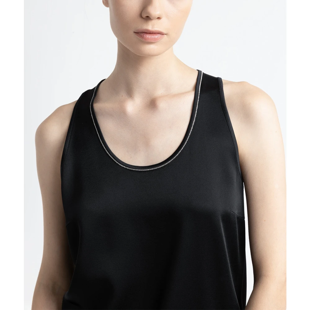 Deze U-hals top in cady enver satijn combineert elegantie en moderniteit en maakt het een essentieel stuk voor de garderobe van elke vrouw. De satijnen stof, zacht om aan te raken en licht glanzend, biedt een reguliere pasvorm die perfect past bij het figuur, comfort en stijl garandeert. De Punto Luce afwerking op de halslijn voegt een vleugje sprankeling en onderscheid toe, waardoor het perfect is voor speciale gelegenheden of om een vleugje klasse toe te voegen aan een alledaagse outfit.
