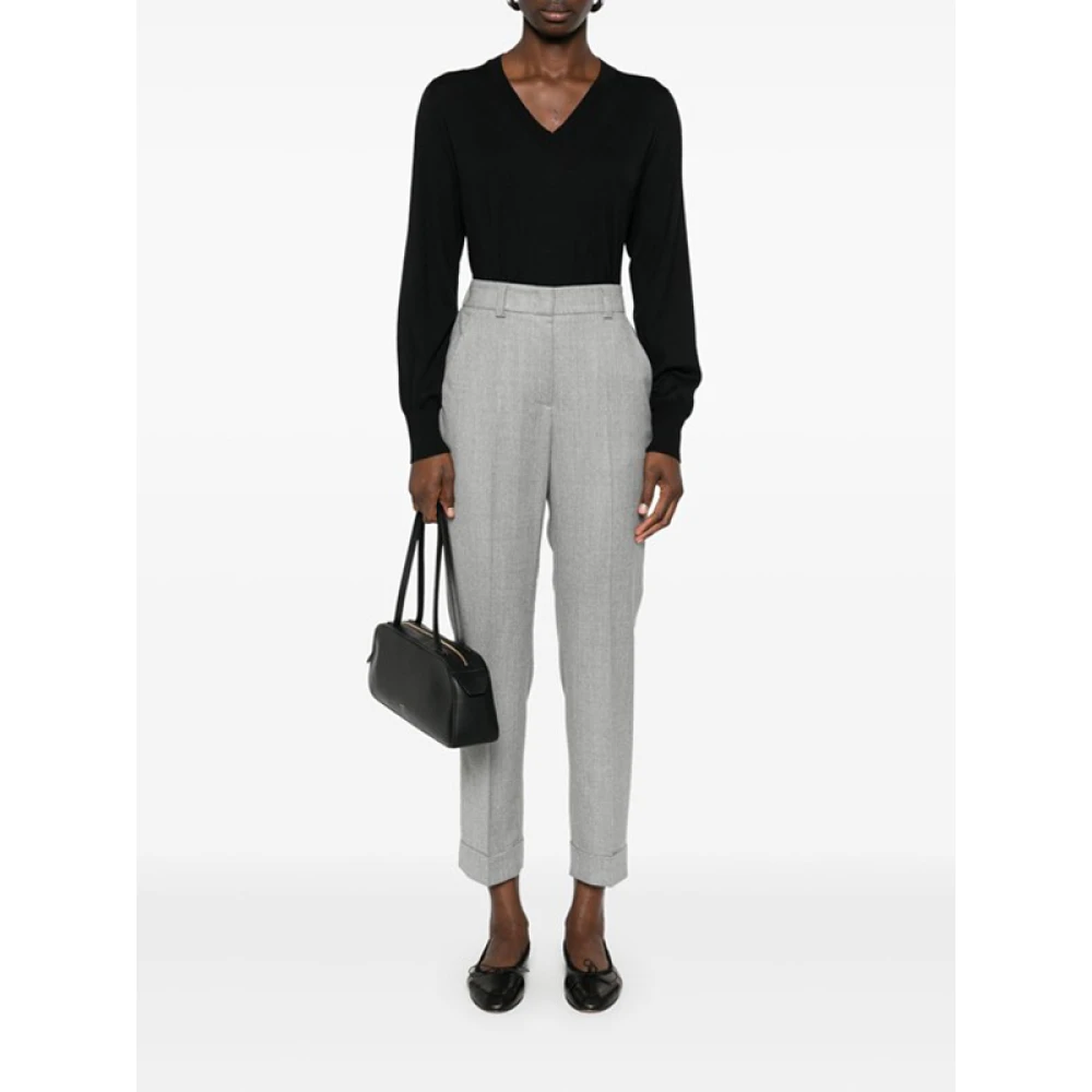 Peserico grijze maagdelijke wol flanellen rechte broek voor vrouwen. Met een gemleerd effect, haak- en oogsluiting, middelhoge taille, riemlussen, plooidetail, twee schuine zijzakken, elastische tailleband, paspelzakken, omgeslagen zoom en een slanke rechte pasvorm.