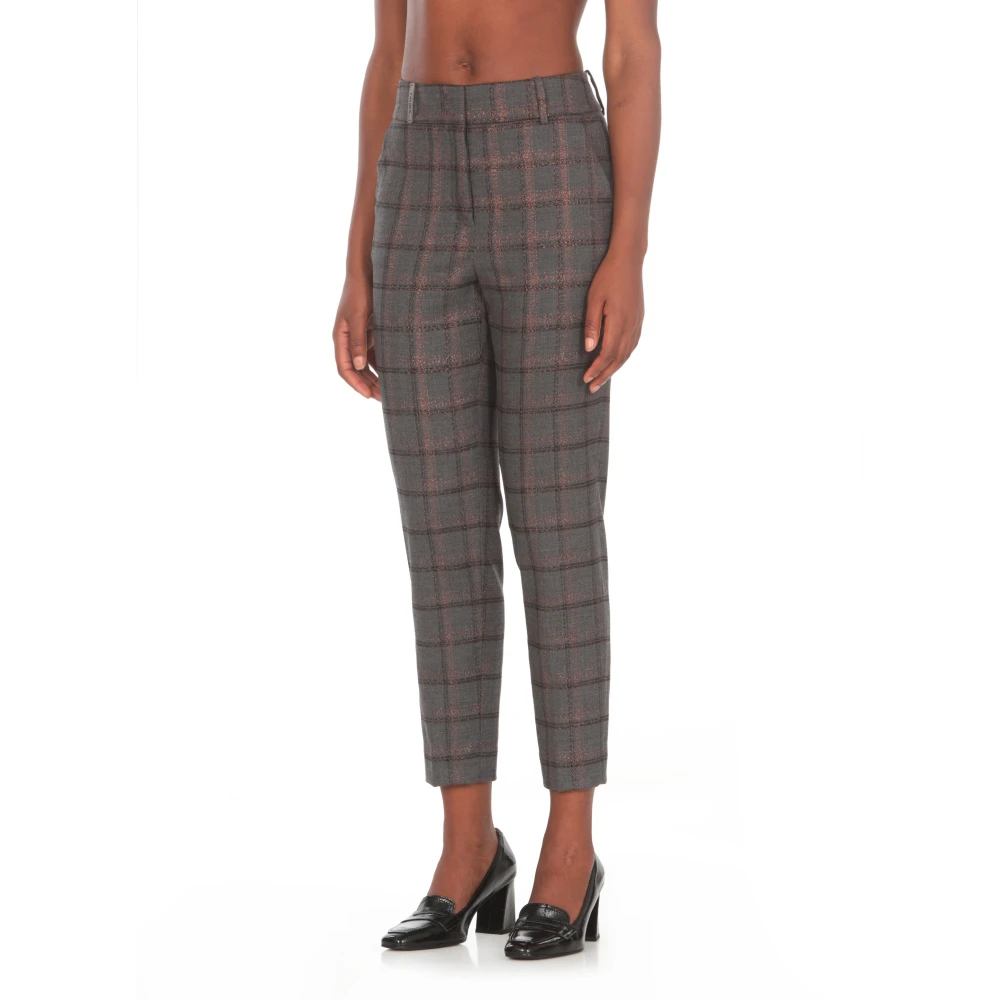 Upgrade je stijl met deze grijze Peserico broek voor vrouwen. Voorzien van riemlussen, twee zijdelingse steekzakken, twee achterzakken en een ritssluiting met haken. Het allover lurex ruitpatroon voegt een vleugje verfijning toe. Het model is 179 cm lang en draagt maat 40.