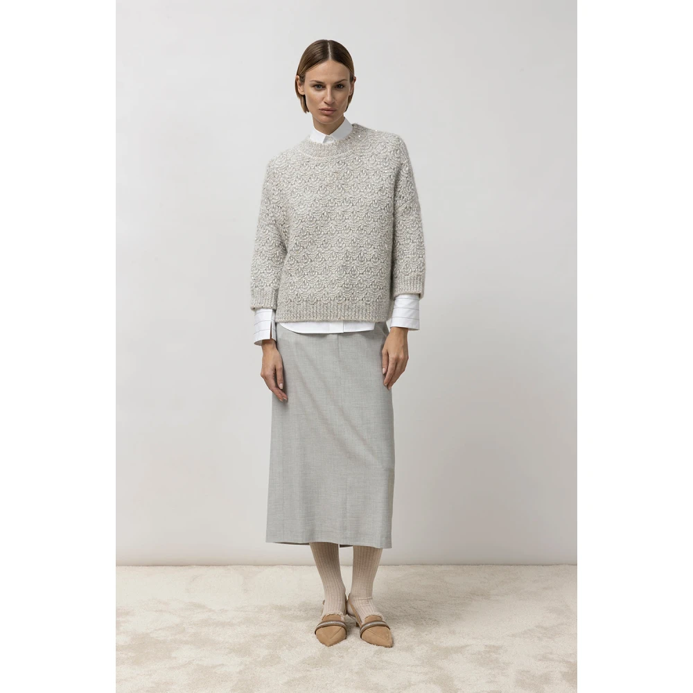 De lange rechte rechthoekige rok is een sleutelkledingstuk van de Transition-capsule. Gemaakt van een tweematerialen keperstof die maagdelijke wol en viscose mengt, is de informele rok in mistig grijs versierd met een Punto Luce-detail op de voorzakken van Amerika.