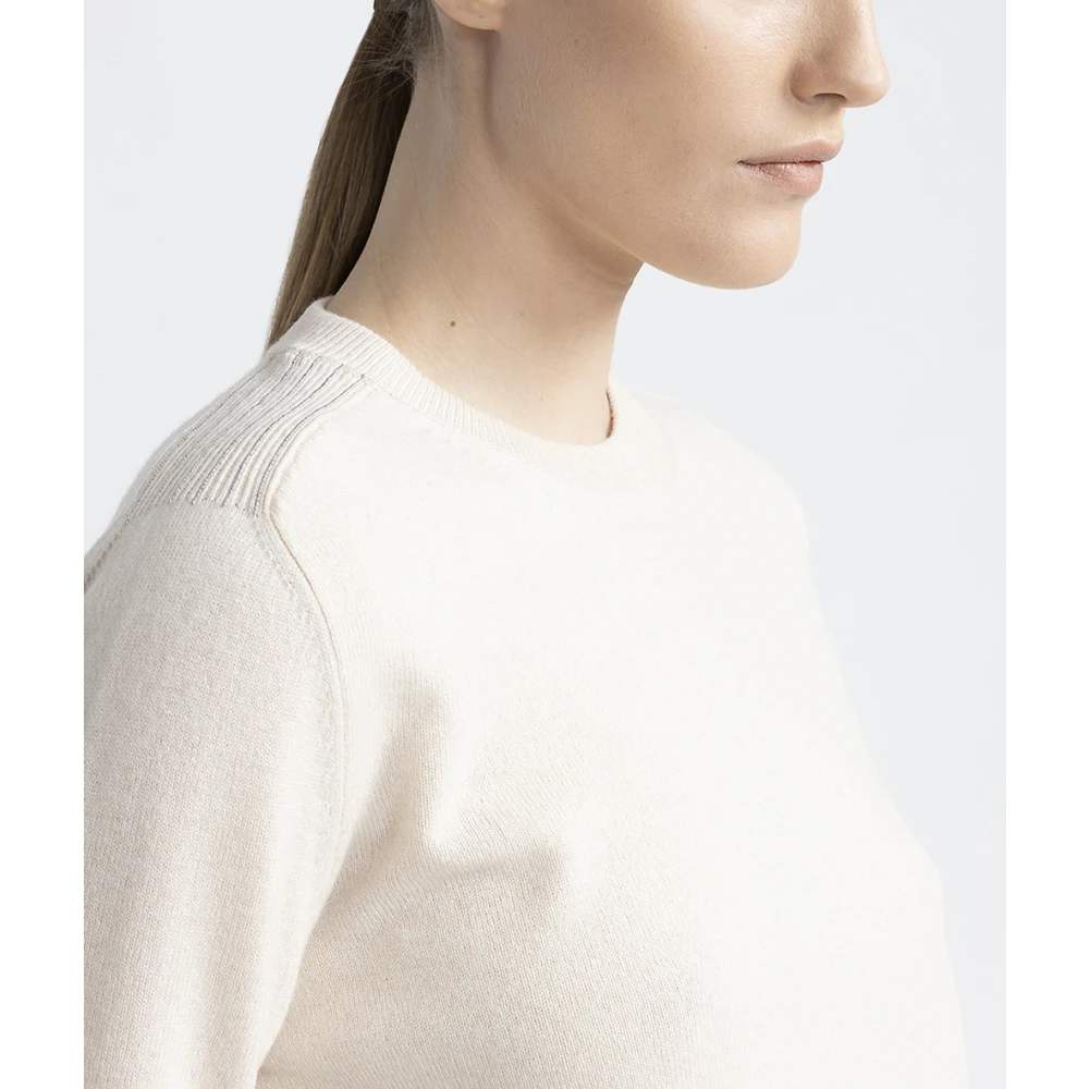 Deze veelzijdige trui van wol, zijde en kasjmier garen is perfect voor elke gelegenheid, van casual tot meer formele looks. De zachtheid en elegante ontwerp maken het een must voor degenen die op zoek zijn naar een combinatie van verfijning en comfort. Het tricotsteek zorgt voor een gladde textuur, terwijl de Punto Luce afwerking op de schouders een vleugje glans toevoegt. De trui heeft een ronde halslijn met strakke lijnen, lange dropped mouwen voor comfort, en geribbelde manchetten, hals en zoom.