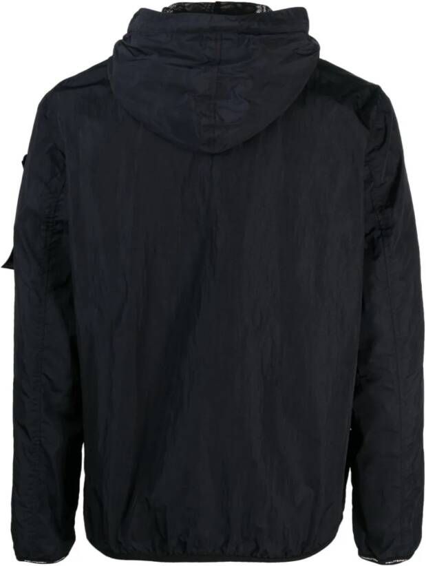 Marineblauw, capuchon met trekkoordsluiting, tweeweg ritssluiting aan de voorzijde, twee steekzijzakken, lange mouwen, elastische manchetten en rechte zoom.