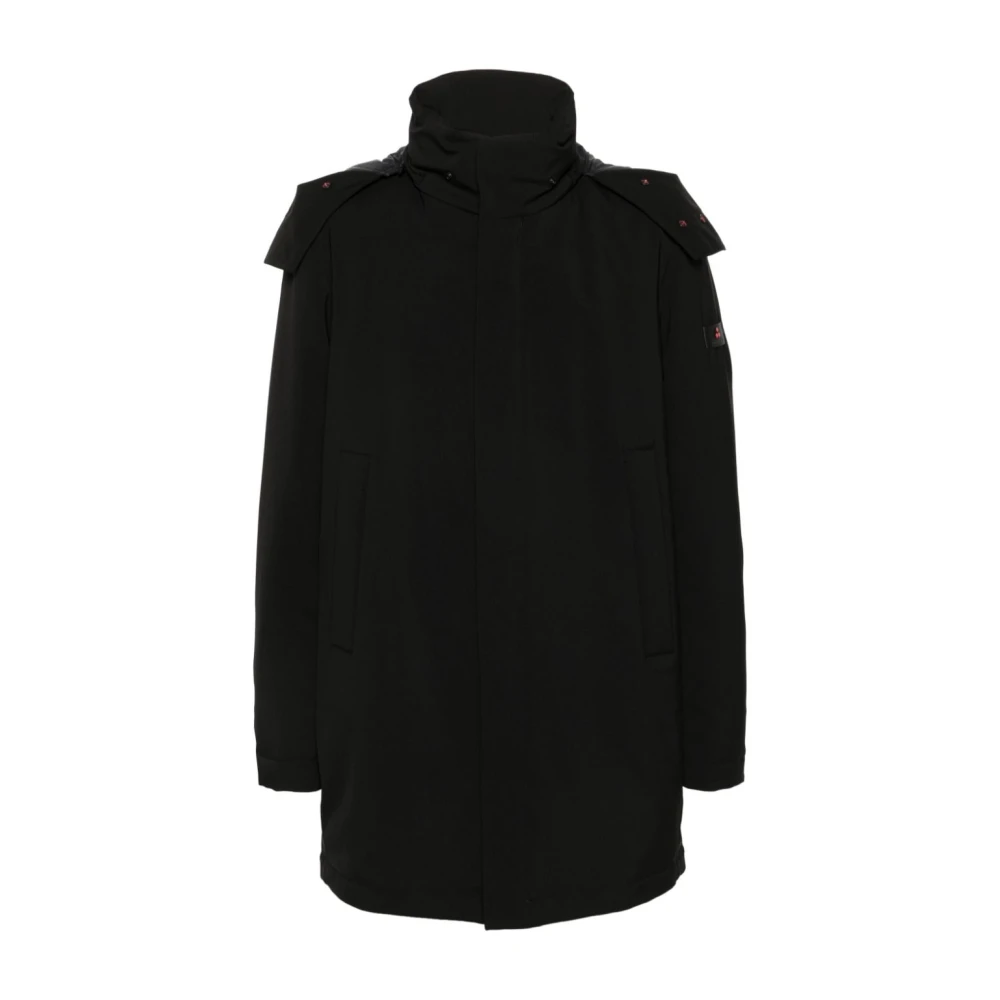 Blijf warm en stijlvol met de Peuterey Kruger Coat in het zwart. Deze dons-gevoerde parka heeft een verborgen rits- en knoopsluiting aan de voorkant, waterafstotende afwerking, afneembare capuchon, hoge opstaande kraag, logo op de lange mouwen, geribbelde manchetten en twee zijzakken met rits. Perfect voor de moderne man. Modelhoogte: 186 cm, Modelmaat: L