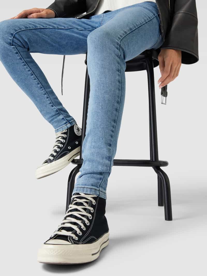 Skinny fit damesjeans van Pieces. Model 'Dana'. Look: mlee. Pasvorm: Skinny fit. Bandhoogte: Mid rise. Applicatie: Labelpatch. Details: Riemlussen. Sluiting: Knoop en blinde ritssluiting. Zakken: 5-pocketdesign. Materiaalverwerking: Denim. Materiaal: Katoenmix. Bandwijdte bij maat S/32: 32 cm. Binnenbeenlengte bij maat S/32: 76 cm