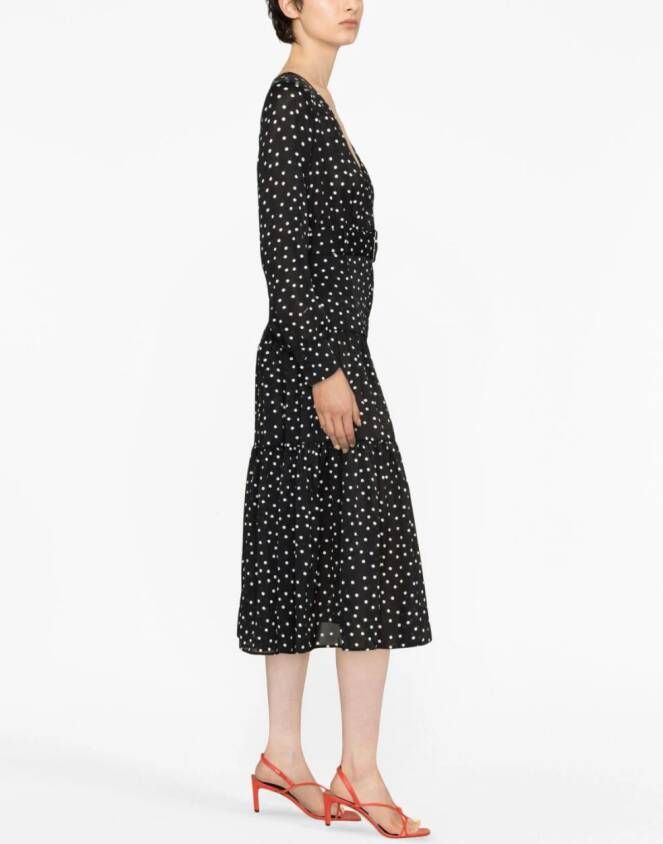Zwart/wit, stippenprint, taille met ceintuur, knoopsluiting aan de voorkant, V-hals, lange mouwen, lengte tot onder de knie en rechte zoom.