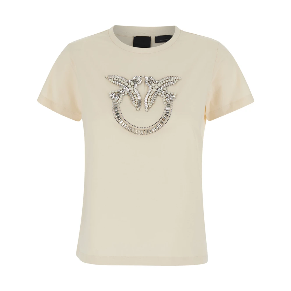 Dames T-shirt van Pinko met geborduurd Love Birds-logo op de borst. Gemaakt van 100% katoen met ronde hals, korte mouwen en een slim fit. Kleur: Wit. Rechte zoom.