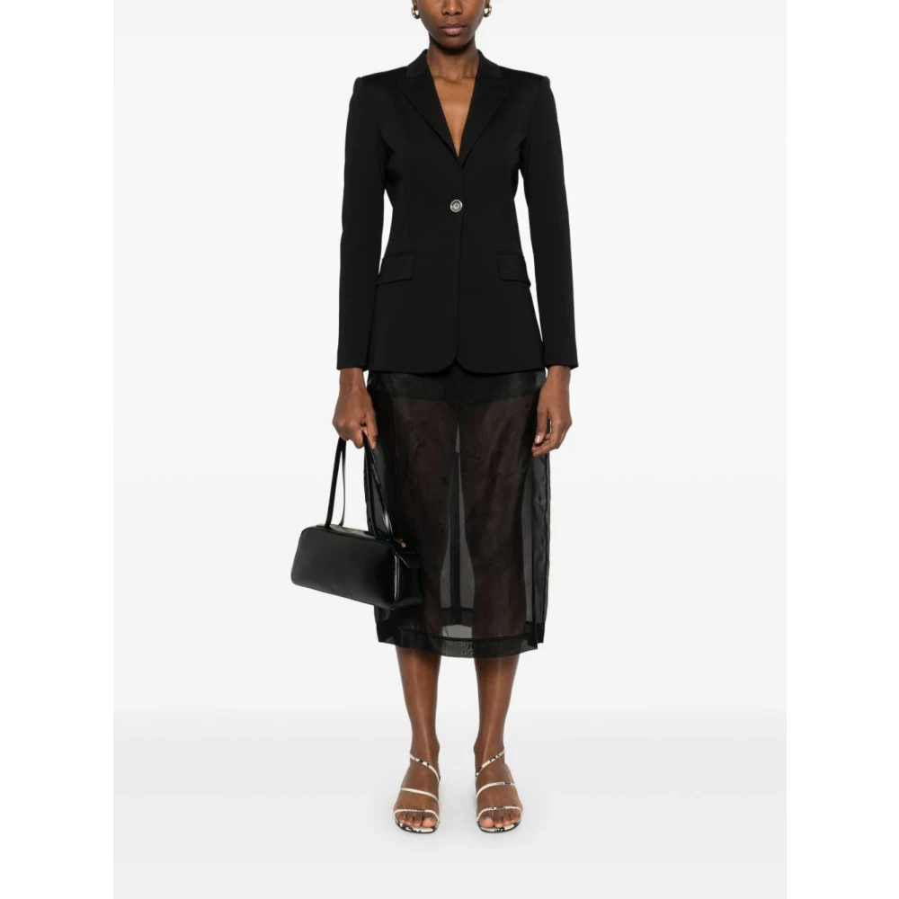 Upgrade je stijl met deze Pinko zwarte blazer met knoopsluiting aan de voorkant, twee voorflapzakken, knoopmanchetten en schoudervullingen. Perfect voor de moderne vrouw.