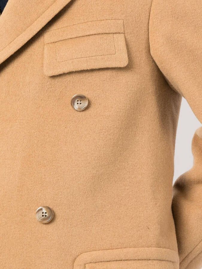 Voorklepzak, twee zijzakken met klep, sluiting met dubbele rij knopen, gekartelde revers, lange mouwen, lange lengte en rechte zoom.