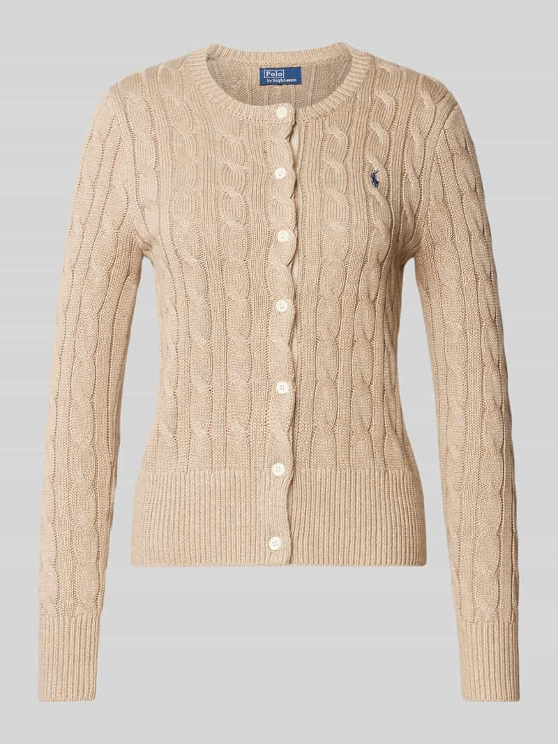 Upgrade je garderobe met deze prachtige beige kabelgebreide cardigan van Polo Ralph Lauren. Met een stijlvolle knoopsluiting, geribbelde details en logoborduursel is dit stuk perfect voor laagjes. Gemaakt van 100% katoen voor ultiem comfort. Modelhoogte: 178 cm; Maat: S, Wassen op 30C