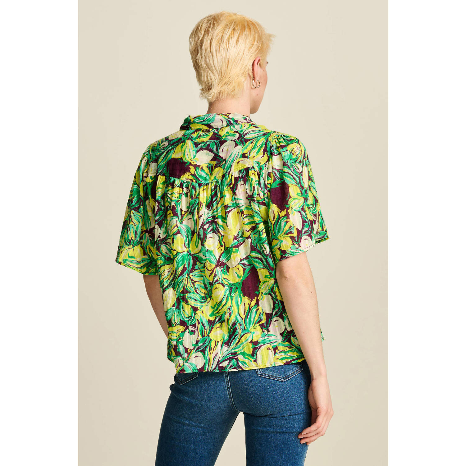 Deze blouse voor dames van POM Amsterdam is gemaakt van viscose en heeft een all over print. Het model heeft een klassieke kraag en korte mouwen. De blouse heeft een knoopsluiting