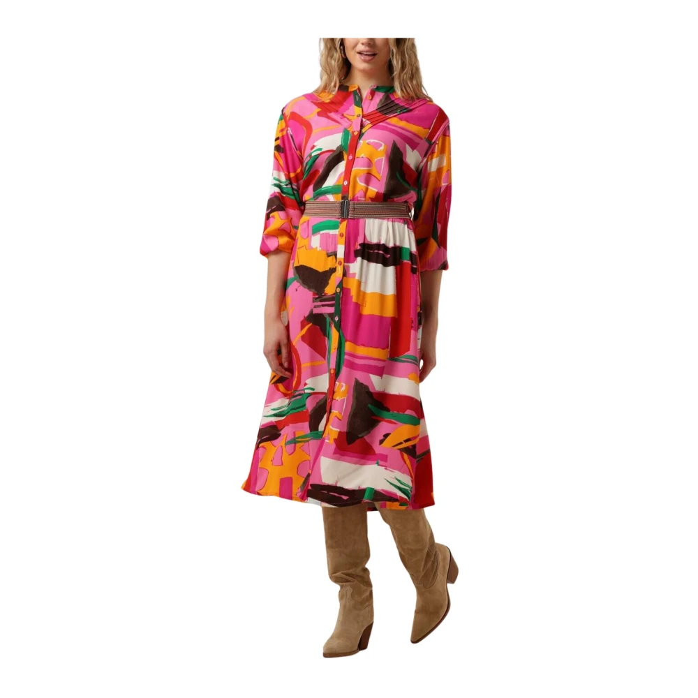 Deze damesjurk van POM Amsterdam is gemaakt van een ecoveromix en heeft een all over print. Het model beschikt over een knoopsluiting. De jurk met 3/4 mouwen heeft verder een mao kraag.details van deze jurk:pofmouweneen ceintuurplooien