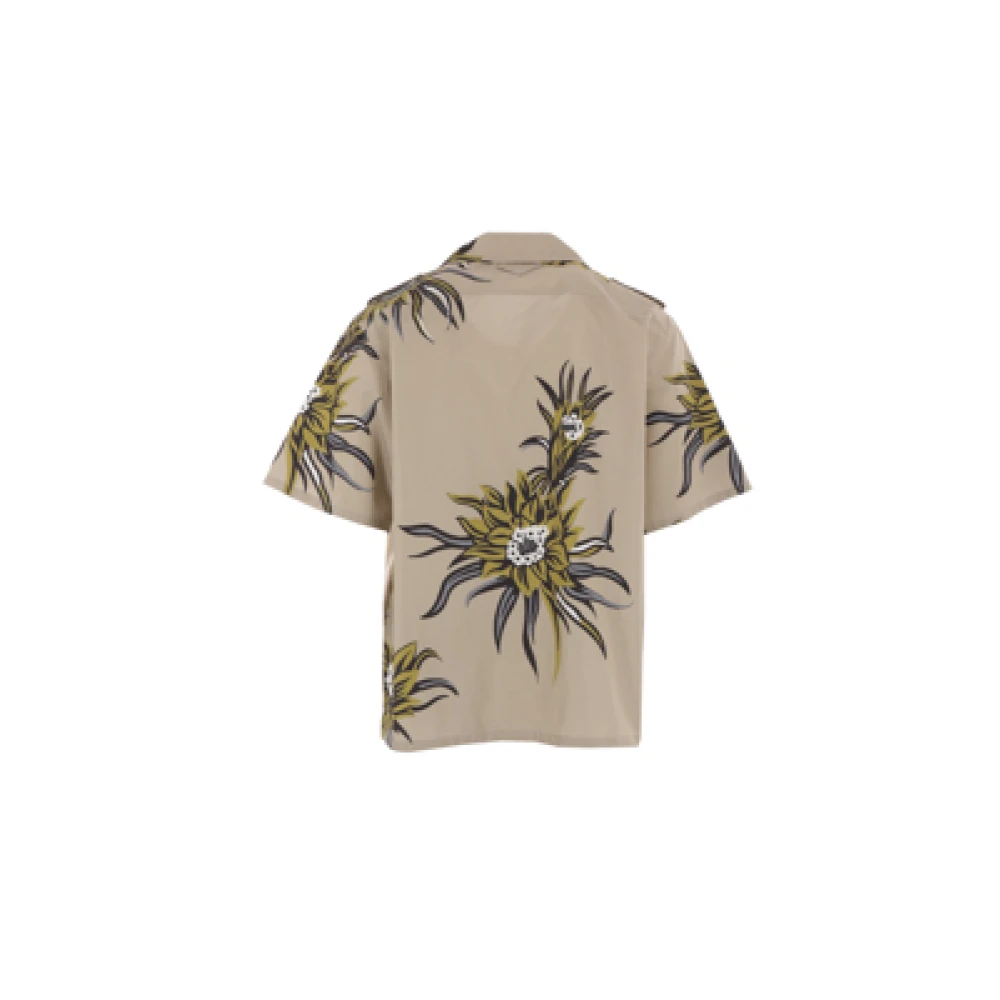 Upgrade je casual garderobe met deze Prada korte mouw bowling shirt in lime grijs poplin met een stijlvol Lilium bloemenprint. Deze shirt heeft een brede revers, knoopsluiting, tabs op de schouders, meerdere zakken en een rechte zoom.