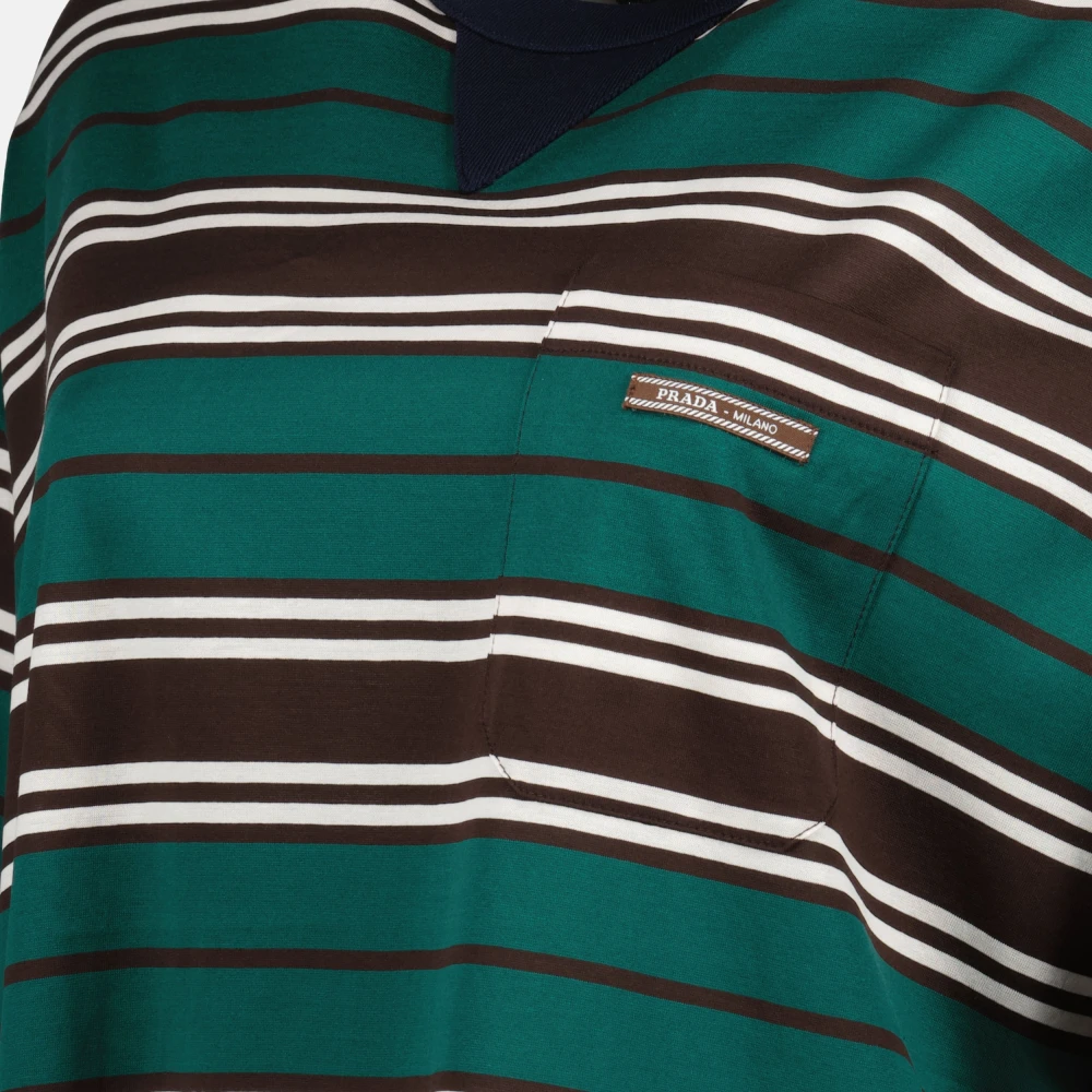 Blijf stijlvol met dit gestreepte groen-bruine T-shirt van Prada voor vrouwen. Onderdeel van de Lente-Zomer 2025 collectie, het heeft een ronde hals en een casual pasvorm.