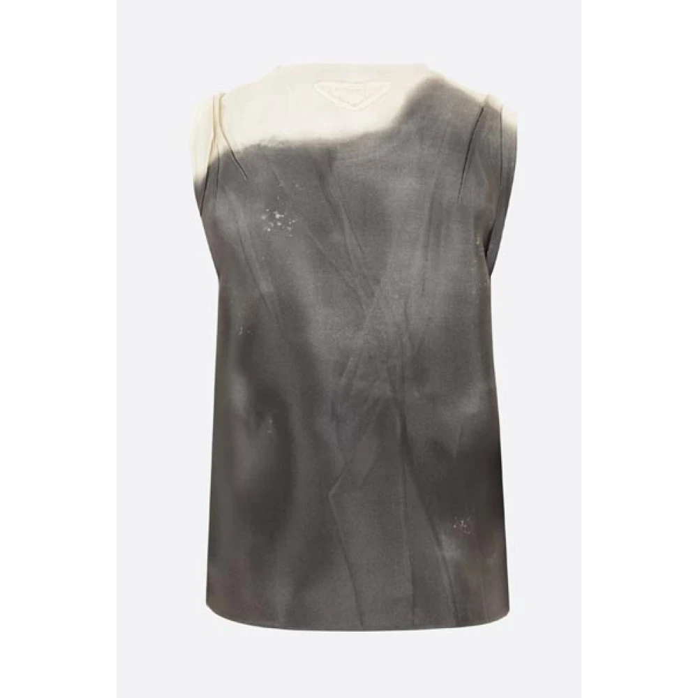 Verrijk je stijl met de mouwloze oversized top van Prada voor vrouwen. Deze top is gemaakt van satijn en heeft een opvallende oneffen geverfde zeefdruk in grijstinten en ivoor. De overal aanwezige geperste vouwen zorgen voor een uniek gerimpeld effect, wat een edgy touch aan je outfit geeft. Met een ronde hals, brede bandjes en een drukknoopsluiting biedt deze top zowel comfort als stijl. De decoratieve knopen en licht uitlopende zoom voegen een vrouwelijk accent toe. Compleet met het kenmerkende Shetland-wollen Triangle-logo van Prada op de achterkant van de nek, is deze top een must-have voor modebewuste individuen.