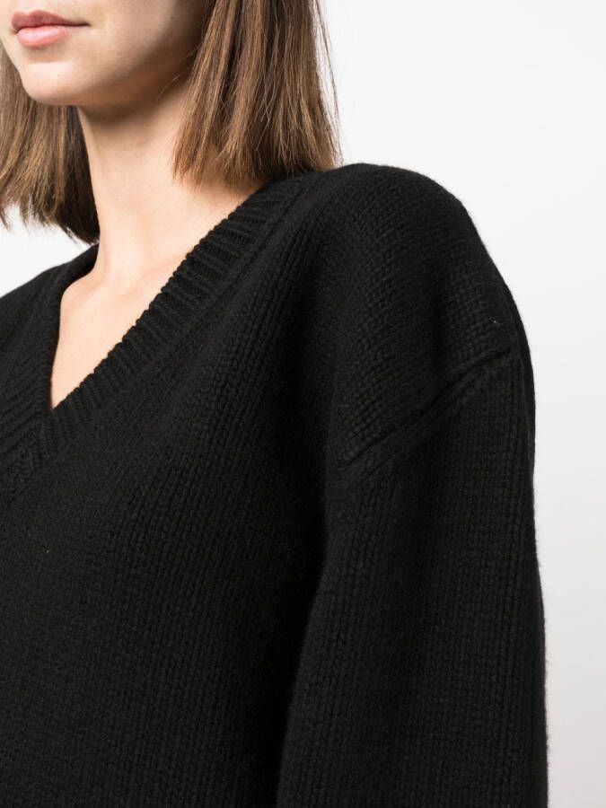 Zwart, scheerwol-kasjmiermix, V-hals, verlaagde schouders, lange mouwen, geribbelde manchetten, geribbelde zoom en gebreid materiaal.