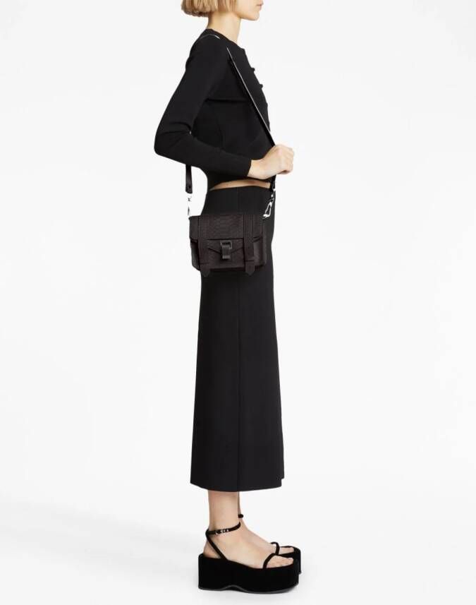 Zwart, matte afwerking, slangenleer-effect, afneembare en verstelbare schouderband, omslag, flip-lock sluiting, verstelbaar halskoord en opgestikt binnenvak.