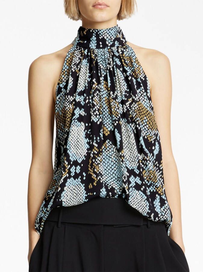 Veelkleurig, slangenprint, gedrapeerd design, halternek, mouwloos en flared afwerking.