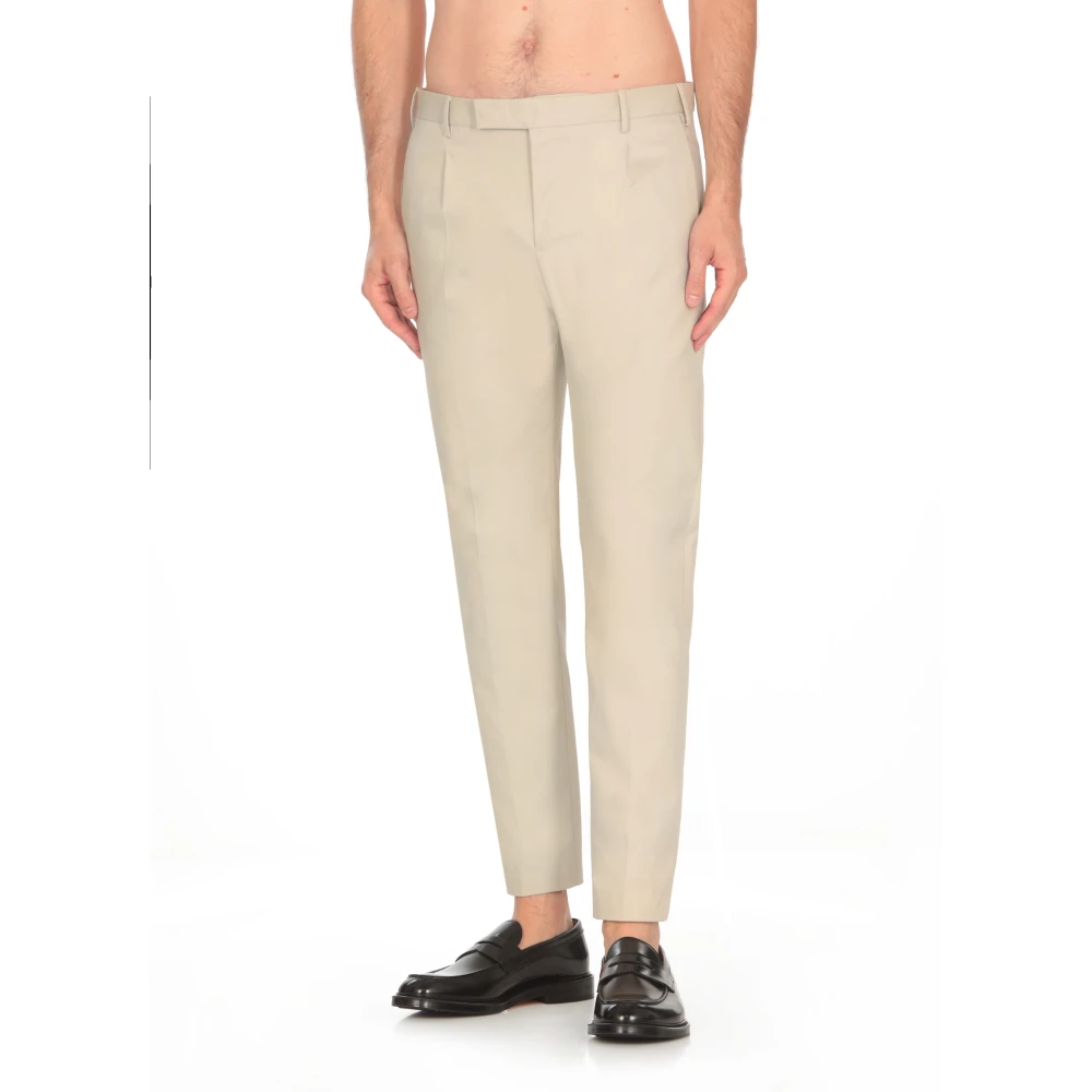 Beige PT Torino katoenen broek voor mannen met riemlussen, twee zijdelingse steekzakken en twee achterzakken met knopen. Voorzien van ritssluiting en knoopsluiting aan de voorkant. Model is 190 cm lang en draagt maat 50.
