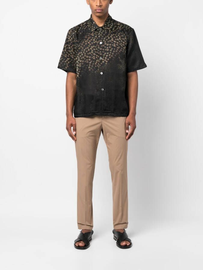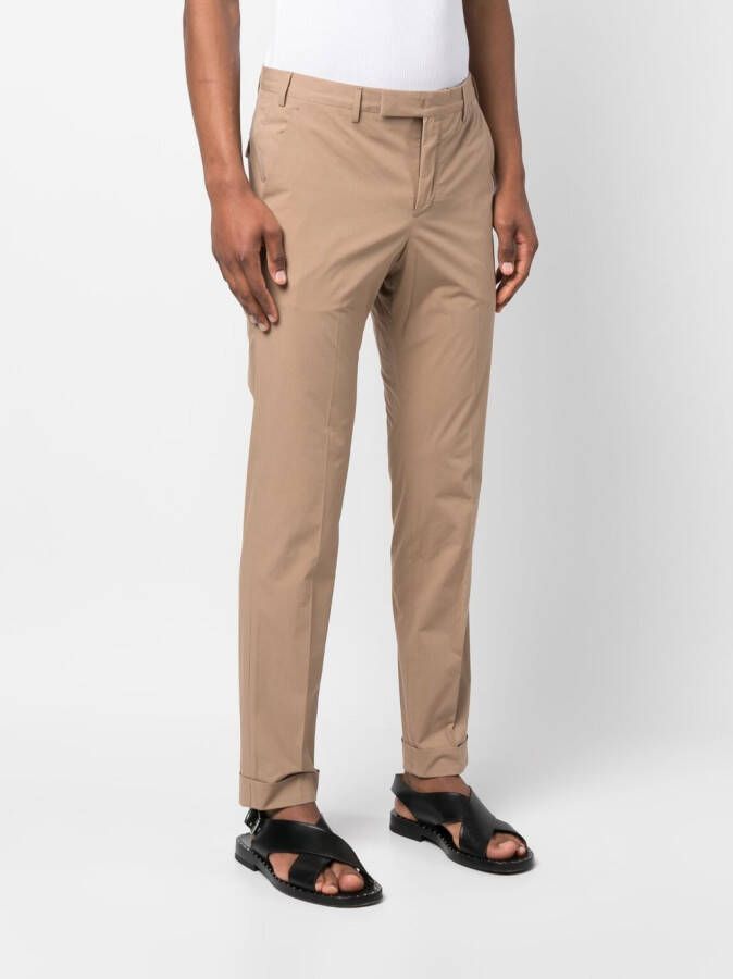 Beige, riemlussen, niet-gecentreerde knoopsluiting aan de voorkant, straight-fit, twee steekzijzakken en twee achterklepzakken.