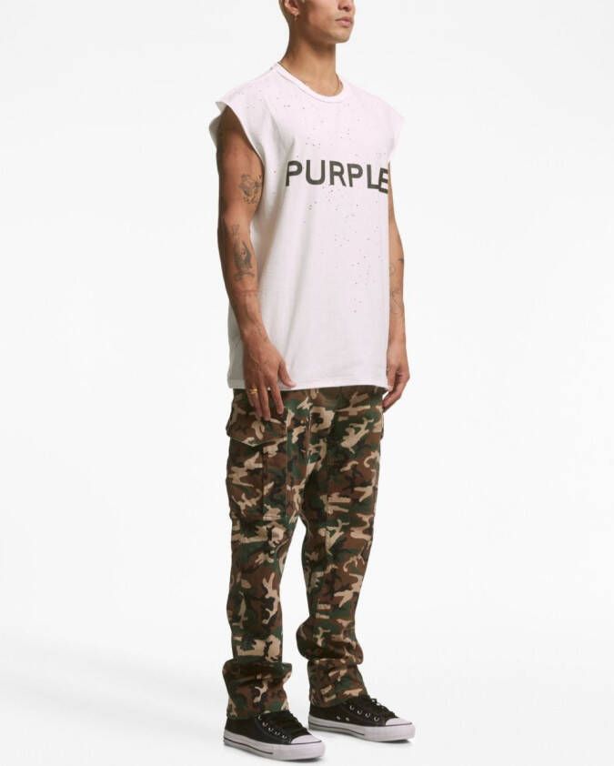Bruin, katoen, camouflageprint, riemlussen, knoop- en ritssluiting aan de voorkant, twee ingenaaide zijzakken en twee cargo zijzakken.